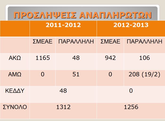 Στον παρακάτω πίνακα βλέπετε πως οι προσλήψεις αναπληρωτών εκπαιδευτικών το έτος 2011-2012 σε ΣΜΕΑΕ ήταν 1165 και το έτος 2012-2013 ήταν 942.