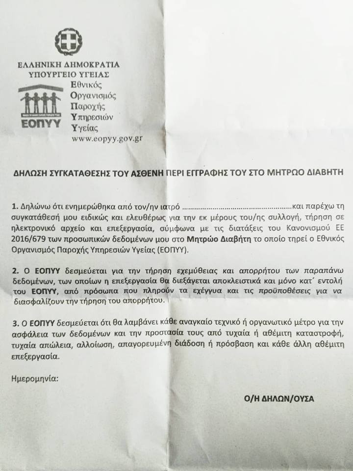 Εντύπωση μας κάνει το γεγονός ότι για να πραγματοποιηθεί η εγγραφή, ο ασθενής αναγκάζεται να παραχωρήσει τα προσωπικά του δεδομένα υπογράφοντας «ΔΗΛΩΣΗ ΣΥΓΚΑΤΑΘΕΣΗΣ ΤΟΥ ΑΣΘΕΝΗ ΠΕΡΙ ΕΓΓΡΑΦΗΣ ΤΟΥ ΣΤΟ ΜΗΤΡΩΟ ΔΙΑΒΗΤΗ». Πολλοί ασθενείς θορυβήθηκαν που ο ΕΟΠΥΥ χρειάζεται πλέον τη γραπτή υποχρεωτική «συγκατάθεσή» του ασθενούς, προκειμένου να διατηρεί ηλεκτρονικό αρχείο με τα προσωπικά του δεδομένα, τα οποία δεν δηλώνει πως μπορεί να τα χρησιμοποιήσει....